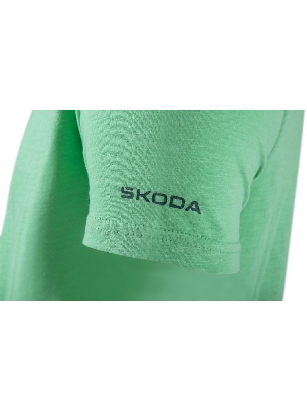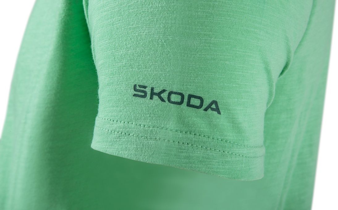 Camiseta de hombre en color verde eléctrico con un estampado del logotipo de Škoda en la manga izquierda. La camiseta tiene un interesante efecto de algodón flameado.