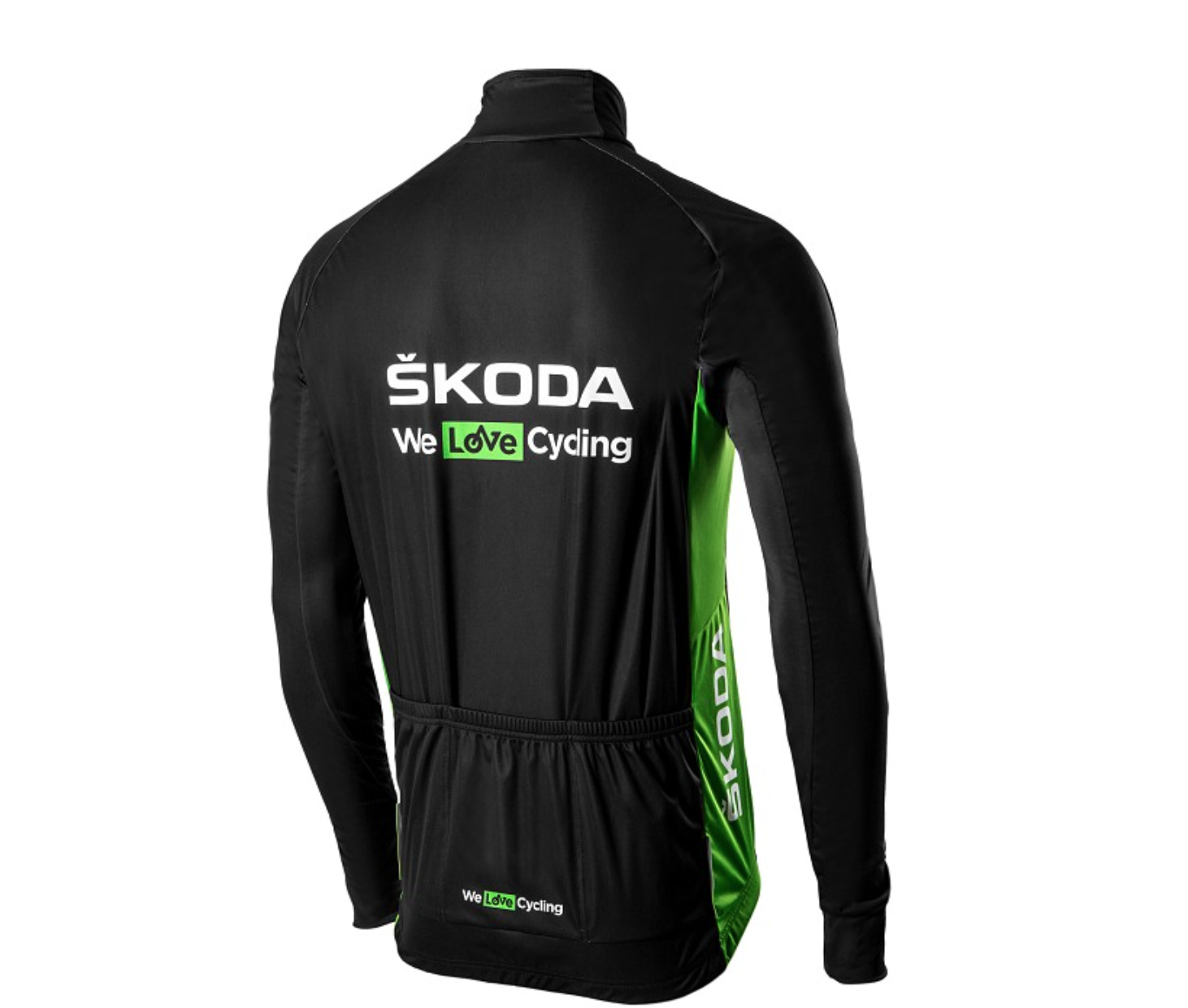Marca: "ŠKODA We Love Cycling" está en el pecho y en la espalda. "ŠKODA" está en los laterales y en los hombros.