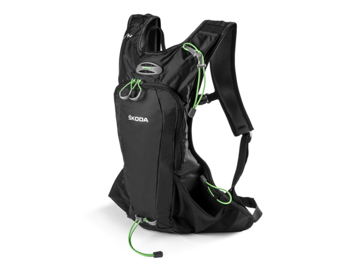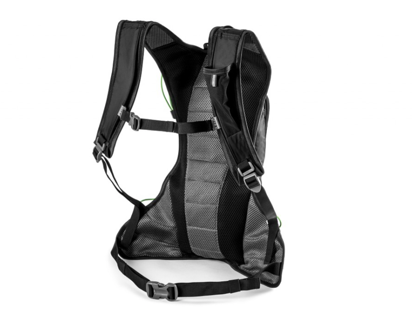 La mochila de ciclismo con la opción de poner el depósito de líquido de 1,5 l tiene un bolsillo interior de malla con cremallera y dos compartimentos exteriores de malla. Otras características son el cinturón pectoral ajustable en altura, el cinturón de cadera, el cómodo acolchado de la espalda, el soporte para el casco, las gomas verdes para sujetar pequeños objetos y las tiras reflectantes para mayor seguridad.